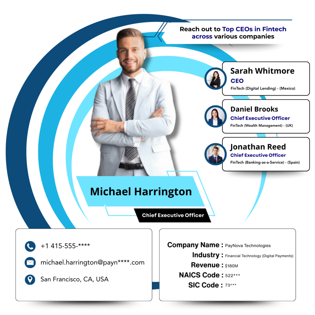 Reaching the right leadership is critical when marketing to fintech organizations. CEOs play a decisive role in evaluating strategic partnerships, investments, and high-impact solutions, making them the most valuable contacts for C-level executives outreach.